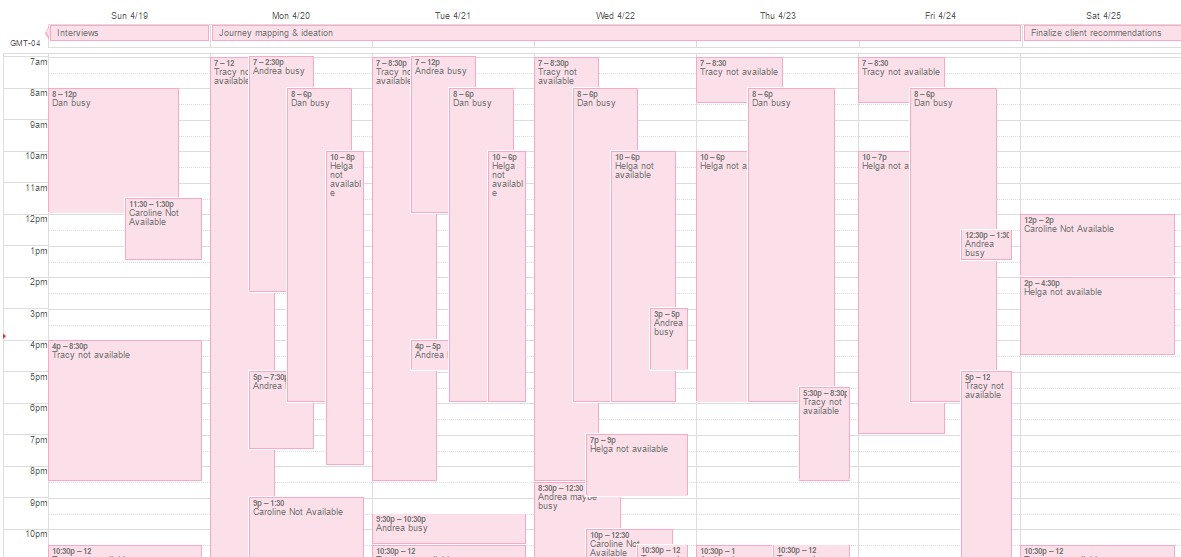 At the start of the project, the team reviewed each member’s capabilities to assign project roles, decided on project tools (Google Hangouts for meetings, Slack and Mural for collaboration), and created a team calendar to schedule regular meetings. The team spanned three time zones, and members had a variety of personal and professional obligations to accommodate.