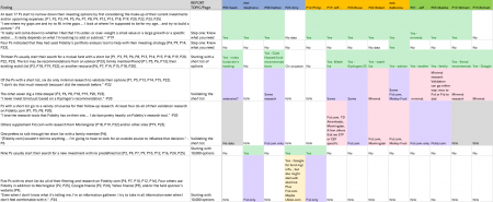 With four days until the read-out, I started over from scratch. First, I created a top-of-mind list of findings in Excel and assigned each participant a column. I then watched all 22 hours of videos, taking copious notes and capturing many quotations. I updated each finding with participant counts and the P #s, then created a color-coding system to try to spot trends in the data.