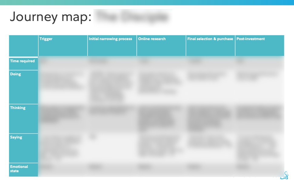 The client liked the matrix approach, but we were still struggling to define the segments. The participants just weren’t splitting into defined groups based on our notes or memories. So the client requested that we pivot: instead of detailed journey maps, they instead wanted to see a detailed report of findings, insights, and quotations from the interviews we conducted, plus notional journey maps if time allowed.