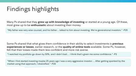 The client is a large and well established mutual fund family that uses Fidelity.com as a selling platform. Their user research team requested a deep-dive study aimed at uncovering the motivators, decision-drivers, and process for individual retail investors purchasing mutual funds. Results would be used to help the fund family create a purchase decision tree and develop marketing initiatives for investors using Fidelity.com to purchase their mutual funds.