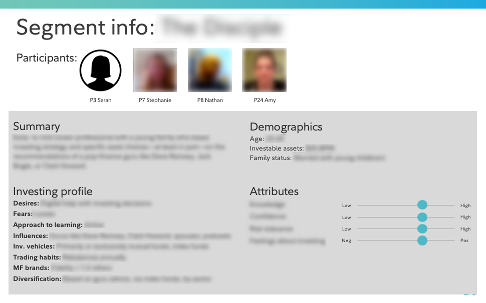 The fund family wanted to hear from 24 mutual-fund customers from three age ranges, and although the plan was to segment the journey maps based on the age groupings, there was agreement that if the data pointed to different groupings, we would adjust accordingly. An external vendor would recruit using a Fidelity customer list.