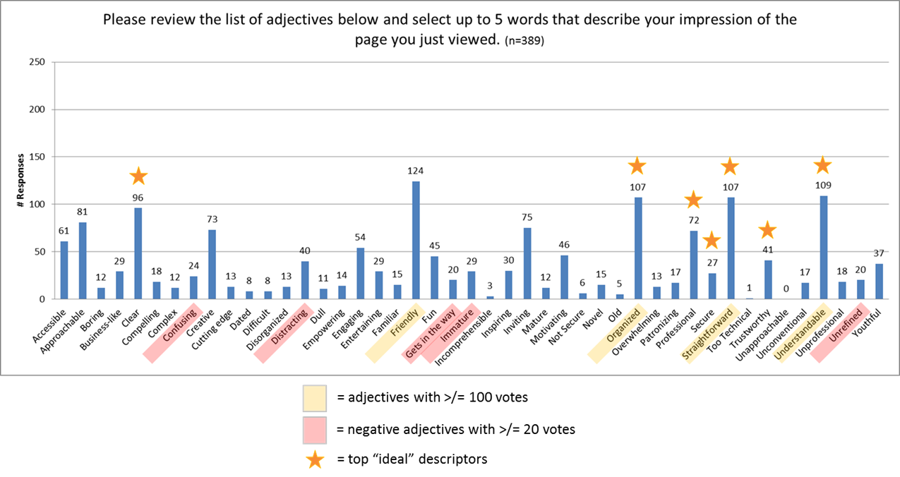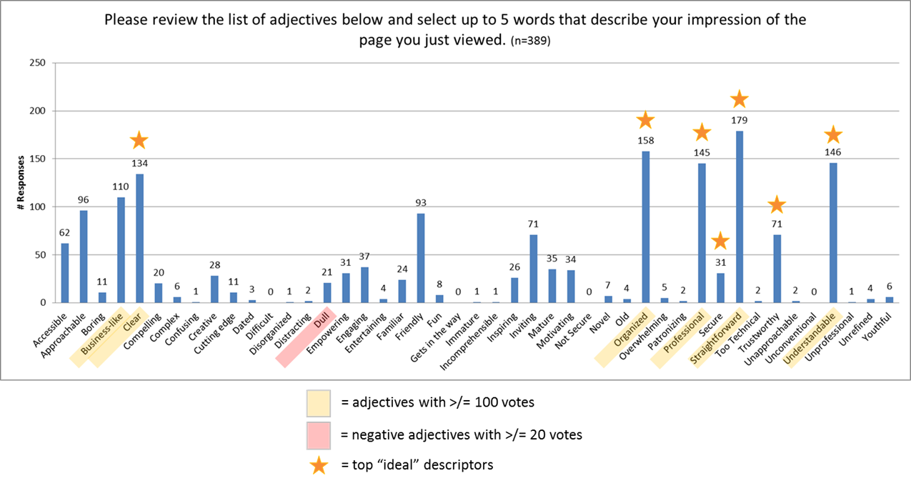 - Modified Microsoft Product Reaction Cards: I wanted to give participants an opportunity to describe the two designs while addressing the study goals, and PRCs were a solid starting point. Microsoft’s list of 118 adjectives was excessive for a quant study—I didn’t want the participants to disengage on the first page—so I cherry picked from the Microsoft list and added a few that met the study goals. I landed on 45 adjectives. At the start of the study, I established a baseline by asking participants to select adjectives they’d use to describe an ideal website on this topic. Then, after showing each design, they selected adjectives from the same list to describe the designs.