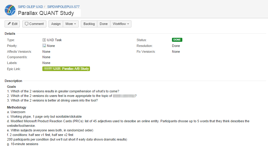 Each ticket represents one research study, and I adopted a standard format for the ticket description that included study goals and methodology.
