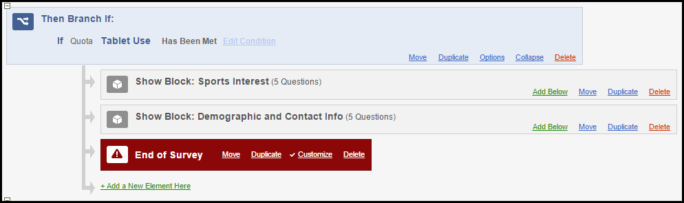 I still wanted to get to the bottom of the problem, so I examined and re-examined the survey. After verifying that the survey flow, end-of-survey messages, and links to the scheduler were correct, I finally discovered the error. The quotas were active no matter how the rest of the questions were answered, so that once 65 men (or 50 non-tablet users, or 50 people unfamiliar with the client’s UI) took the survey–regardless of whether they passed–no man would receive the message with the link to the scheduler.