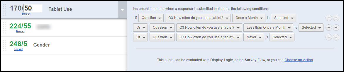 Part of the recruit requirements included quotas: we needed no more than five female participants, at least twenty tablet users, and at least twenty participants who were familiar with the client’s current UI. I created quotas in Qualtrics for 65 men, 50 non-tablet users, and 50 not familiar with the client’s UI and incorporated them into the survey flow logic.