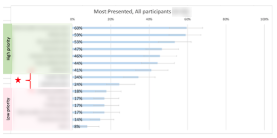 Overall product feature prioritization brought to you by most-least.io. Despite the small sample, we saw distinct trends here. One of the product features that was touted as a differentiator scored very low and has since been scrapped.